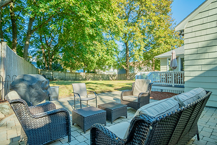 with a cobblestone patio, deck, shed and sprinkler system. |